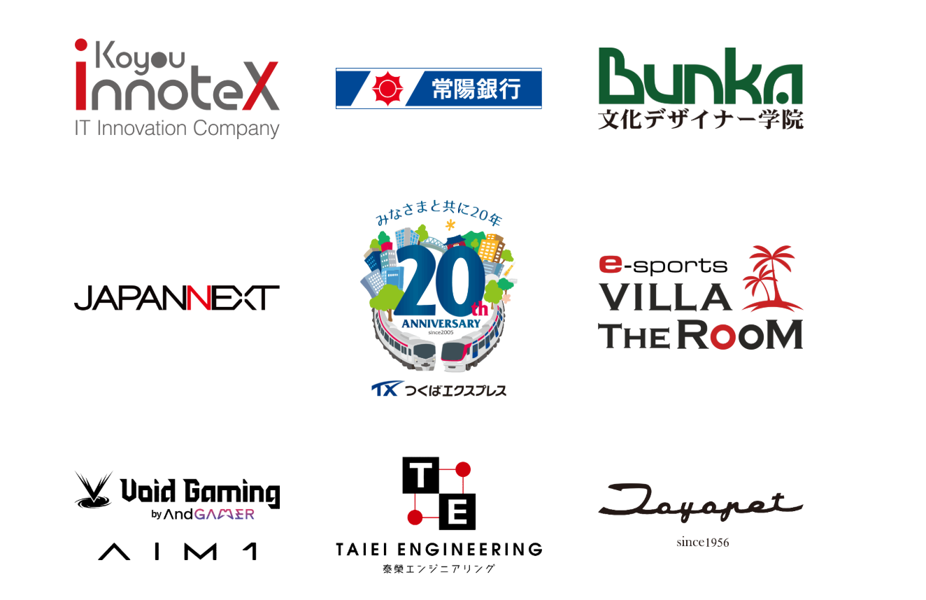 飛鳥未来きぼう高校水戸本校、AndGAMER、e-sports VILLA THE RooM、 eスポーツカフェ Tsukuba Solid State、茨城県社会福祉協議会、茨城トヨペット 、 オカムラ、 ORB GARDEN、JAXA、専門学校文化デザイナー学院 、泰榮エンジニアリング、 筑波高校、 つくばビジネスカレッジ専門学校、 土浦工業高校、 水戸啓明高校、 水戸葵陵高校、REIGNITE、IT未来高校 |
